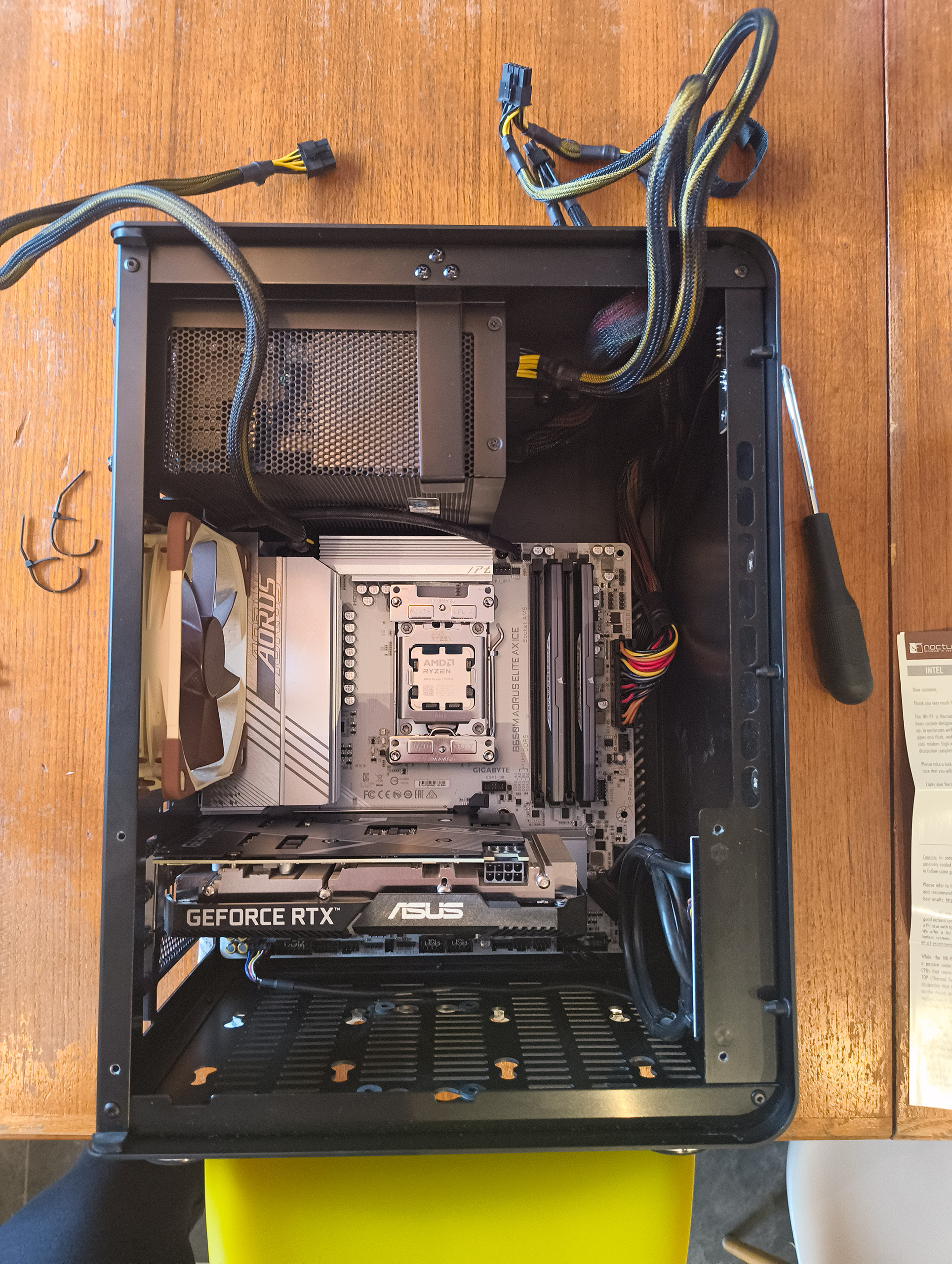 Jeg må si at jeg ble veldig overrasket over hvor enkelt det var. Datamaskinen hadde en to år gammel SSD, som jeg bare fjernet og installerte på det nye hovedkortet sammen med den nye prosessoren (det var en bytte fra en Intel Core i7 6700 til en AMD Ryzen 7 9700X) og minne.