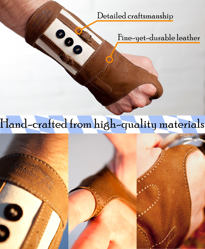 Ølhansken er laget i robust lær og har en design som emulerer den ikoniske bayeriske folkedrakten «Lederhosen». Når man tar på seg en OktoberFist, er man straks utkledt og klar til enhver (tyroler-)fest. The OktoberFist er både et alternativ og supplement til Lederhosen, står det i den temmelig underholdende pressemeldingen.