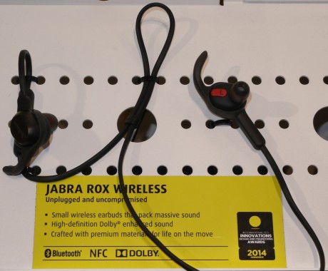Jabra presenterte også et par nye trådløse ørepropper.  Rox Wireless har en solid ledning som kan legge bak nakken.