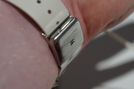 Dessverre er vårt første inntrykk av Galaxy Gear ikke udelt positivt. Klokkeremmen virker stiv, og den er da også proppet med en masse funksjonalitet (kamera, mikrofon og høyttaler), og selve klokken er også temmelig stort, selv på denne skribentens relativt voksne underarm!