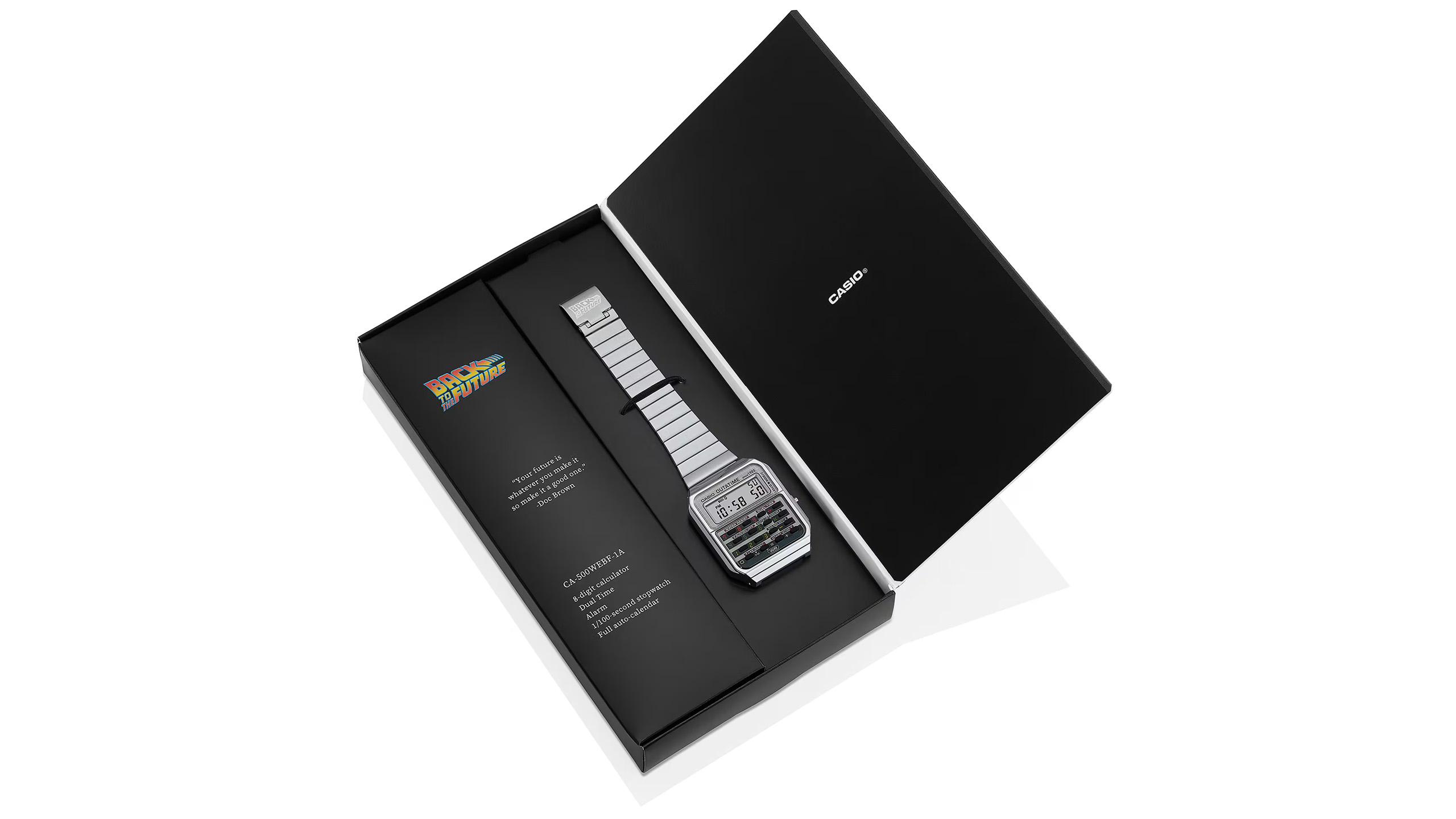 Skiven er designet for å ligne displayet på tidsmaskinens dashbord, og selv om klokken knapt kan nå 88 miles i timen, kan den gjøre noe som Marty McFlys originale CA-53-klokke også kunne: skryte av en fullt funksjonell kalkulator. En funksjon som i dag er omtrent like praktisk som en hestetrukket trikk, men som i 1985 var ren og uforfalsket fremtidsteknologi.