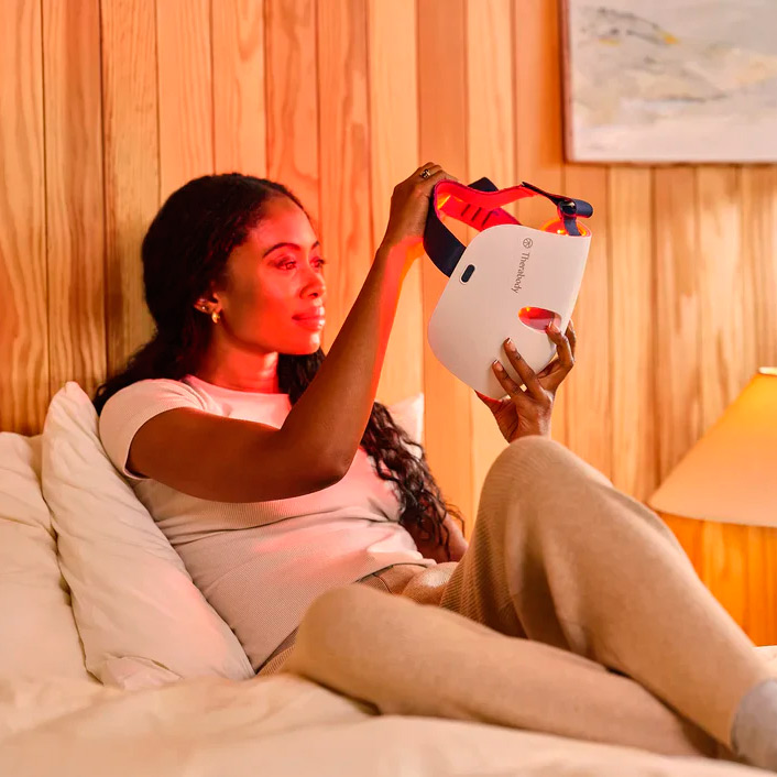 TheraFace Mask Glo er en LED-ansiktsmaske som kombinerer tre lysmoduser (rødt lys/rødt pluss infrarødt lys/blått lys) med hodebunnsmassasje for å gi en friskere hud.