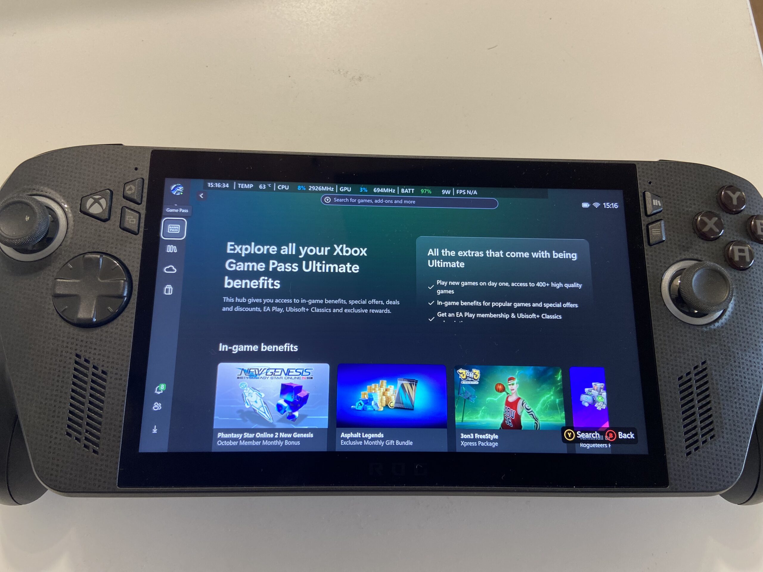 Xbox har nå en dedikert knapp til Xbox-biblioteket ditt, Game Pass og streaming. Når man slår på Xbox Ally, starter den direkte opp i denne appen fremfor det vanlige Windows. Det sparer RAM fordi man likevel ikke bruker de vanlige Windows-funksjonene hvis man utelukkende gamer. Xbox-knappen brukes også til raskt skifte mellom innstillinger og snarveier til for eksempel Steam (som for øvrig tilbyr en god porsjon av PlayStations eksklusive spill). Det er derfor ikke mye man ikke kan spille med en ROG Xbox Ally i hånden.