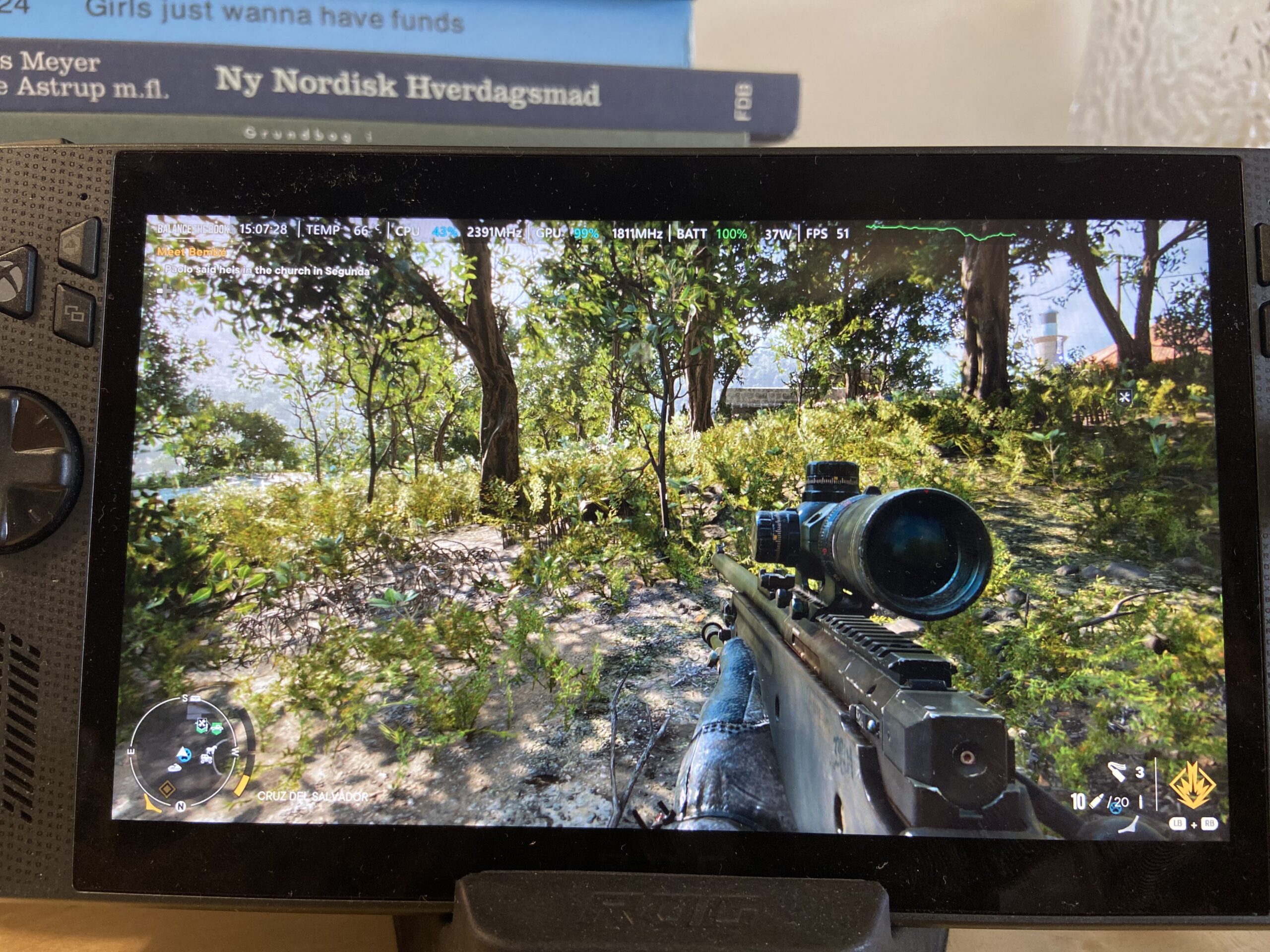 Det visuelt imponerende og samtidig actionfylte Far Cry 6 er fortsatt en fornuftig motstander, og på medium grafiske innstillinger (med full 1080p-oppløsning og i den maksimale “35W turbo”-strømtilkoblet modus) kommer vi ofte opp på 65 fps, noe som er ekstremt imponerende. Det laveste jeg kunne presse den til var 50 fps.