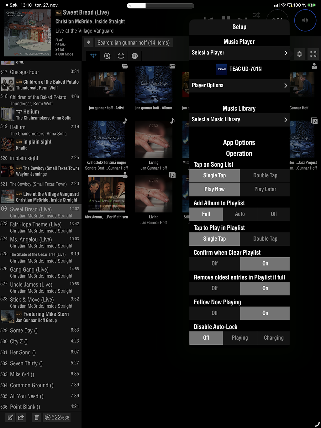 Med strømming fra Tidal via TEAC-appen, merker man hvor mye mer oppløsning og klarhet den leverer, enn for eksempel en av våre gamle favoritter, NAIM ND5 XS2. Som lyder varmere og behagelig, men maskerer mikrodetaljer mye mer enn UD-701N gjør.