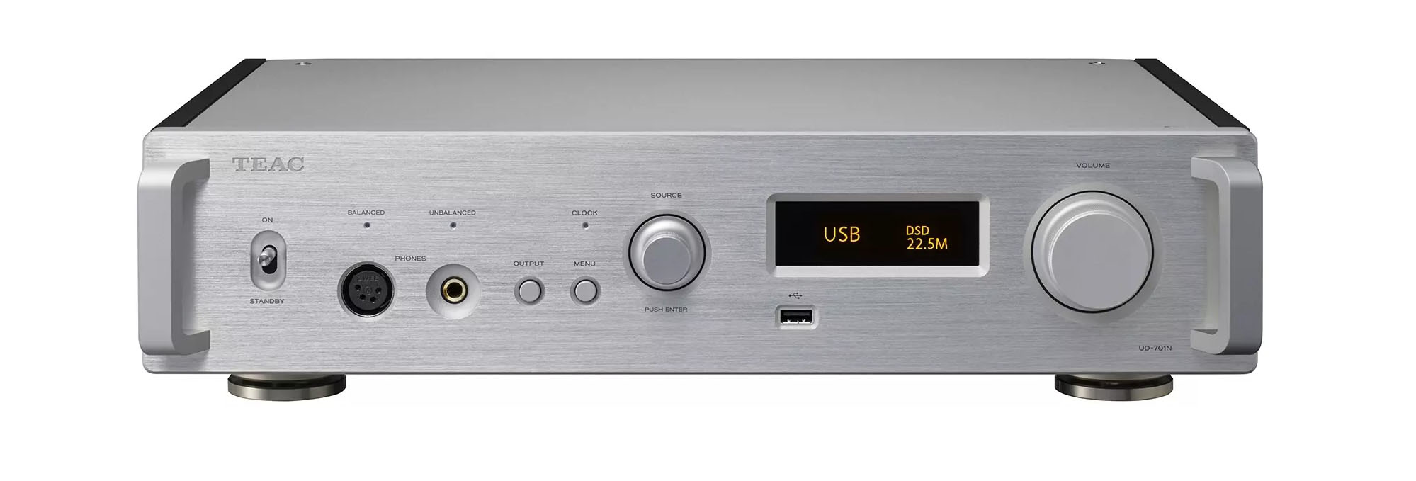 Men det er ikke alt. Her får man en svært påkostet DAC – digital til analog konverter – med TEACs egenutviklede Delta-Sigma-DAC. Med både optiske, koaksiale og USB-innganger for digitale lydkilder, kan UD-701N erstatte både en DAC og en forforsterker. Ja, en hodetelefonforsterker også. For den innebyggede, med både 4-pins balansert og jackkontakt, er faktisk svært god og takler hodetelefoner fra 16 til 600 Ohm.