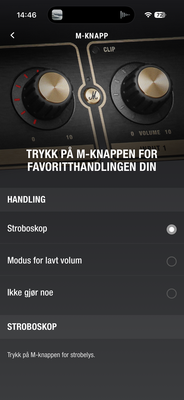 Det finnes en app, så klart, med grunnleggende betjening av høyttaleren, og her kan man velge hva slags funksjon den bittelille M-merkede knappen på fronten skal ha. Men det finnes ingen eq-innstillinger i appen, og man kan ikke koble sammen to høyttalere trådløst i stereo, men høyttaleren støtter Auracast slik at man kan strømme musikken til flere høyttalere samtidig.