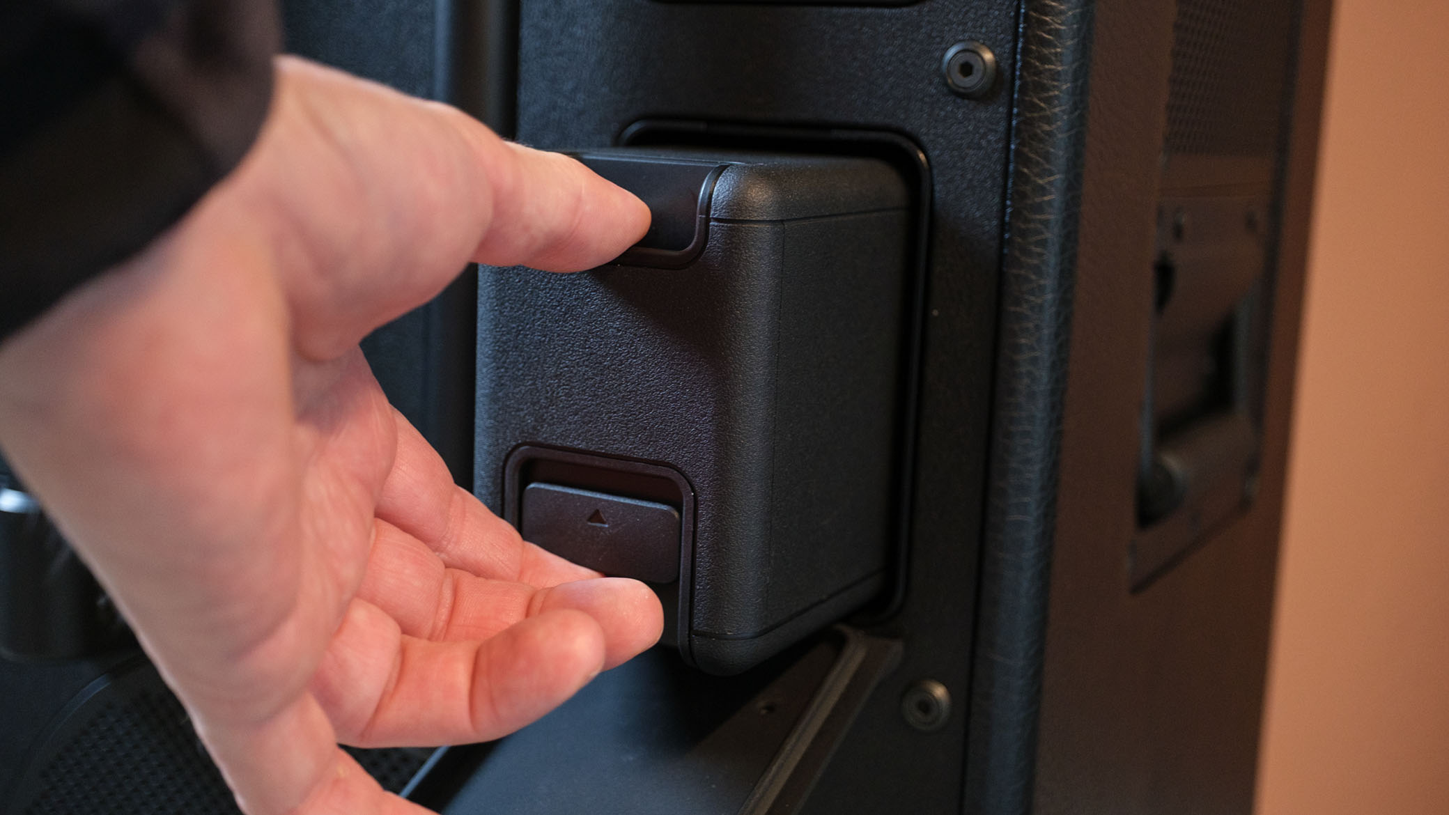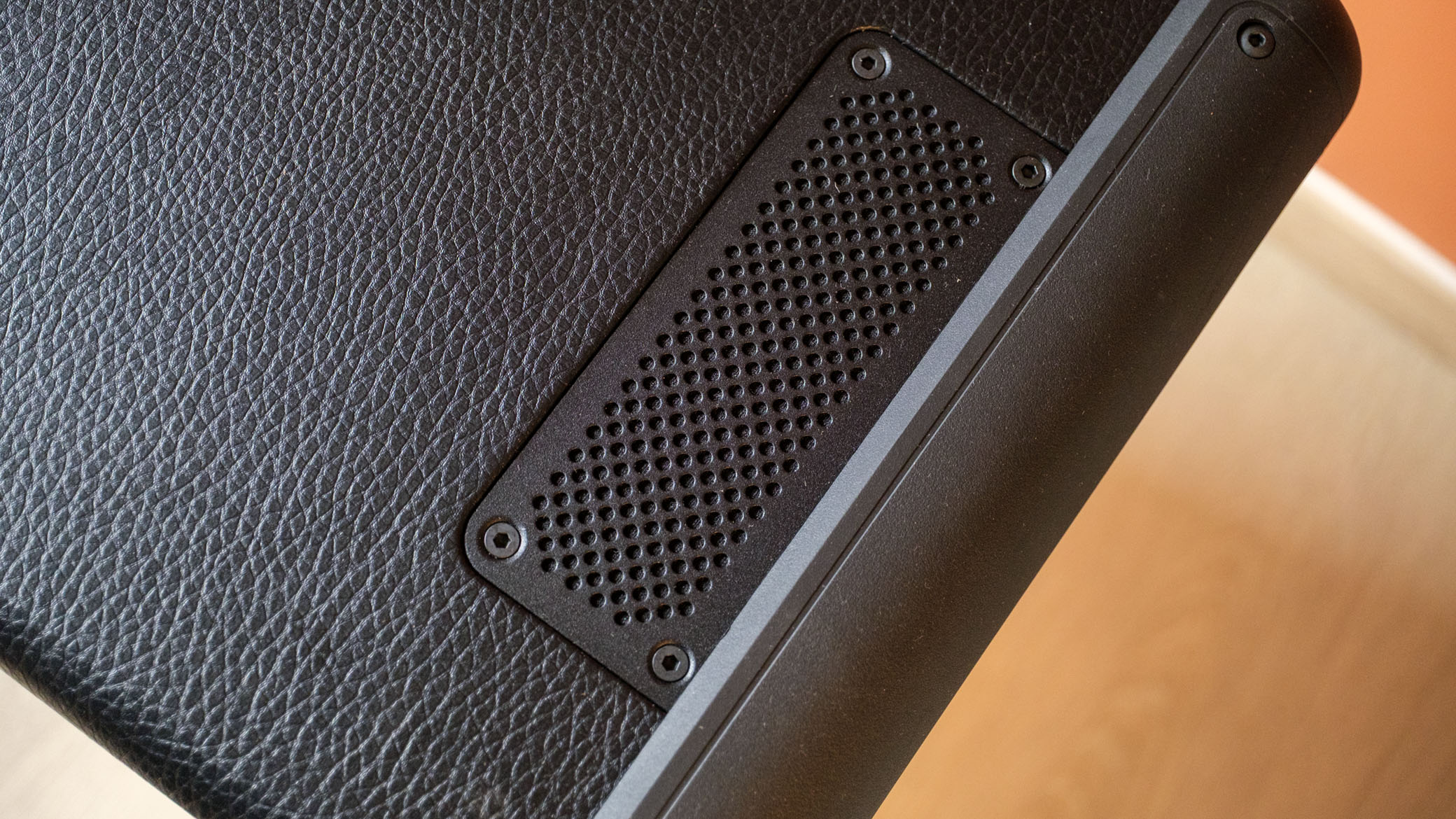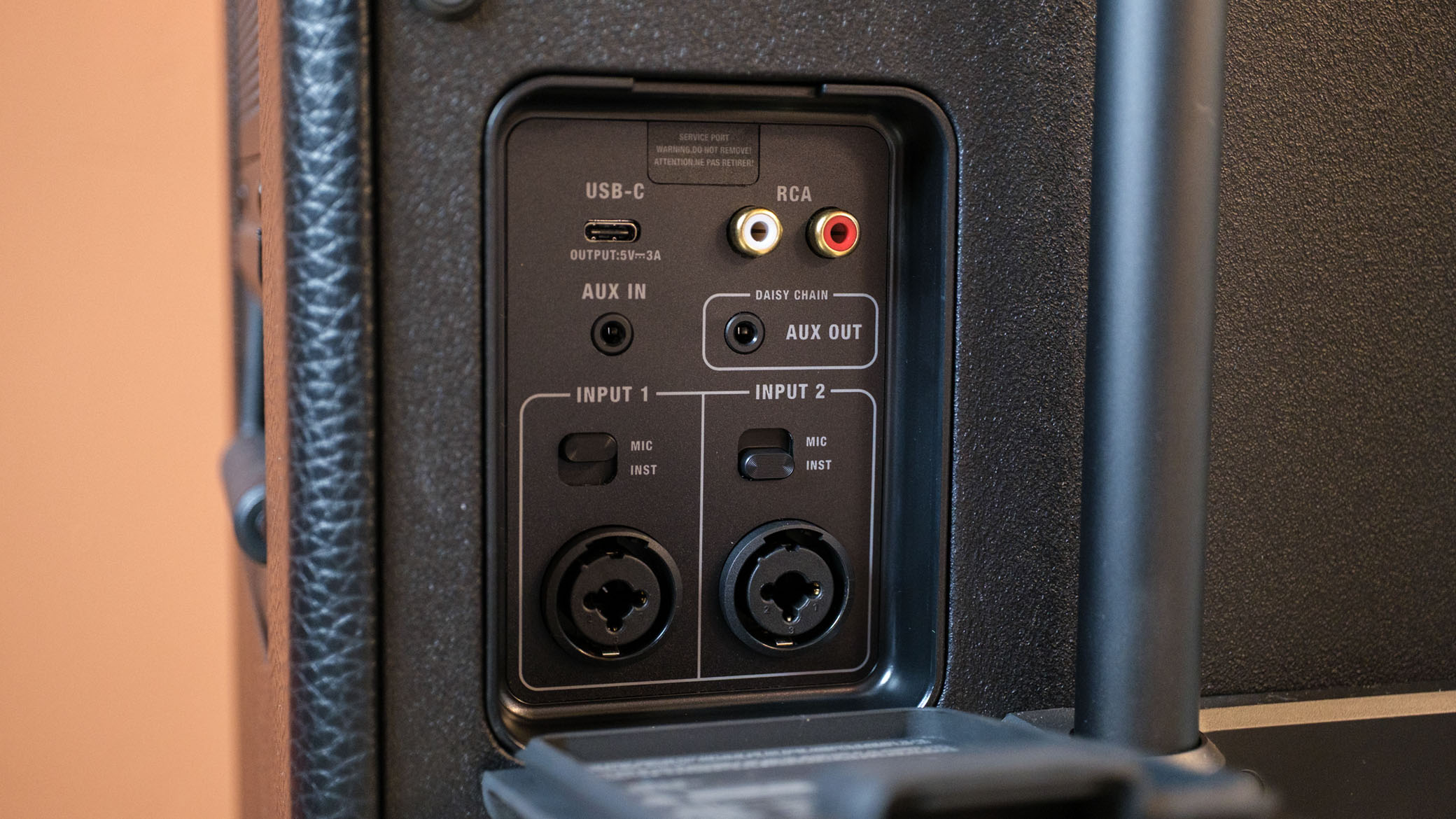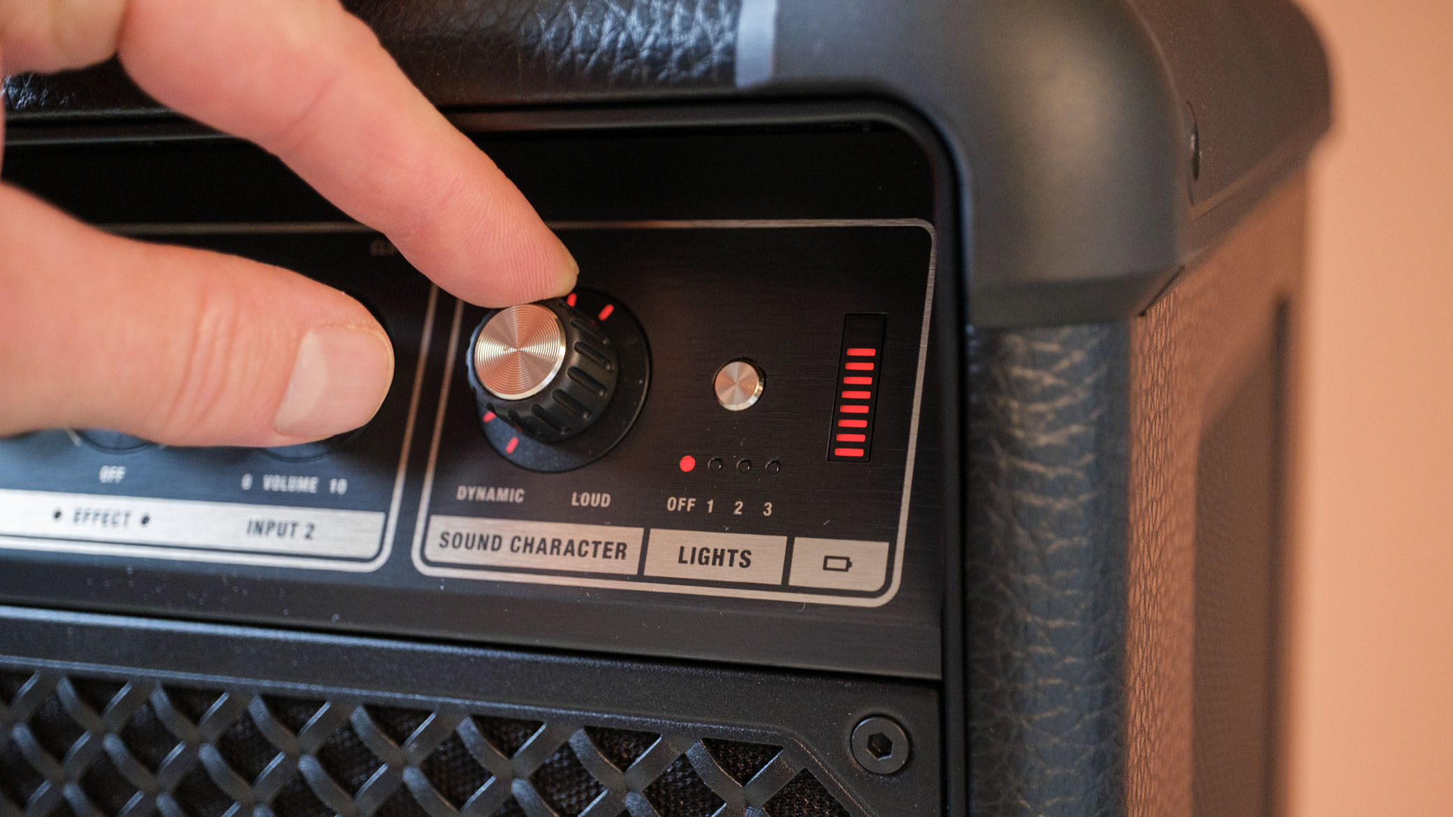 Høyttaleren ligner åpenbart en av Marshalls gitarforsterkere, og du kan selvsagt plugge en gitar inn her også. Eller en mikrofon. Eller begge deler, samtidig. Kontaktene for XLR og jackplugger finner man under et gummiert deksel på baksiden.