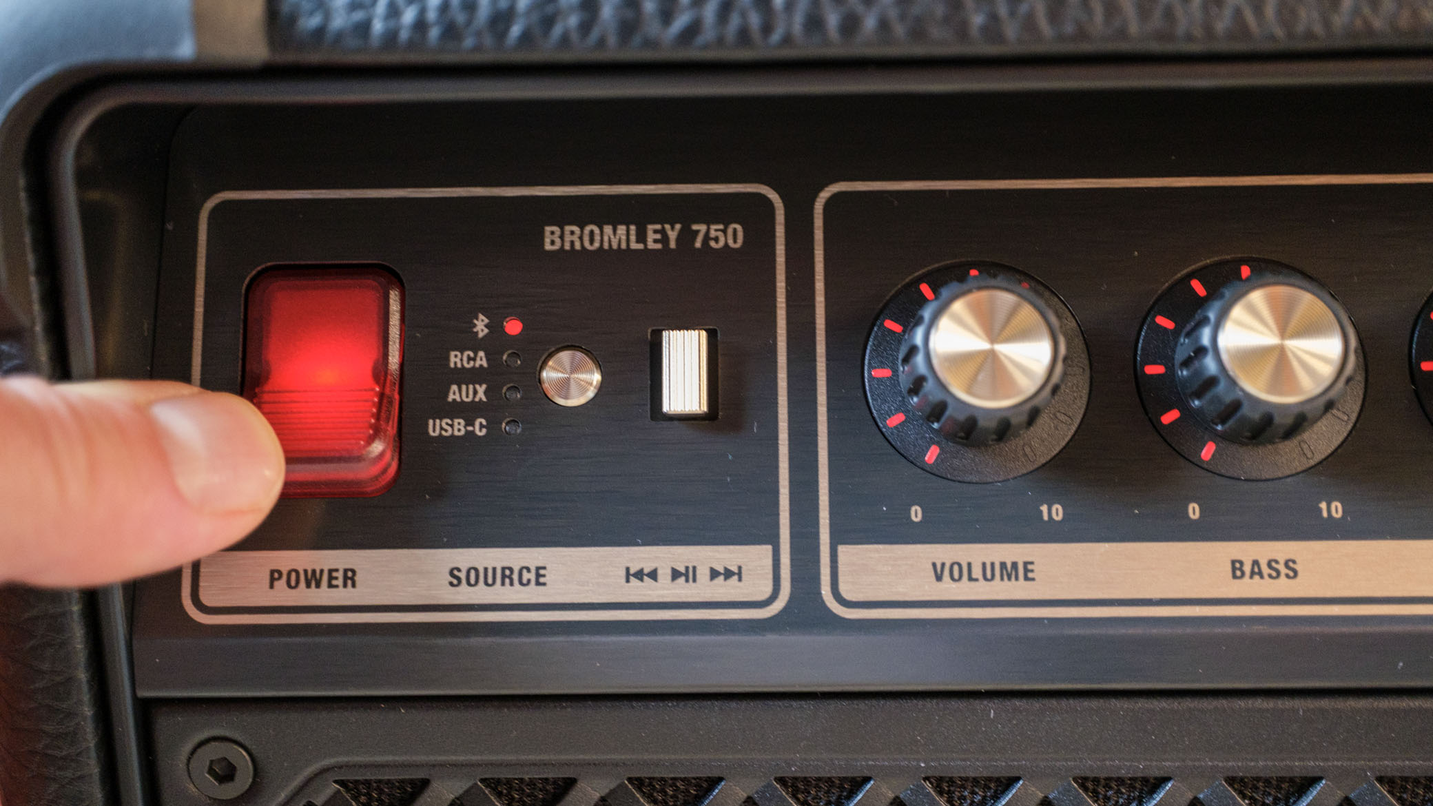 På fronten har Bromley 750 potmetere for volum, bass og diskant, og volum for tilkoblede i instrumenter, og en effektpot i midten. Helt til høyre har den et potmeter som endrer lydkarakteren. Drei den helt til venstre for en tørr studiolyd – Dynamic, og mot høyre for stadionlyd med mer trøkk og klang – LOUD. Man kan slå av og på alle LED-lampene med en knapp, og f.eks. bruke M-knappen til å slå på stroboskoplys hvis man foretrekker det.