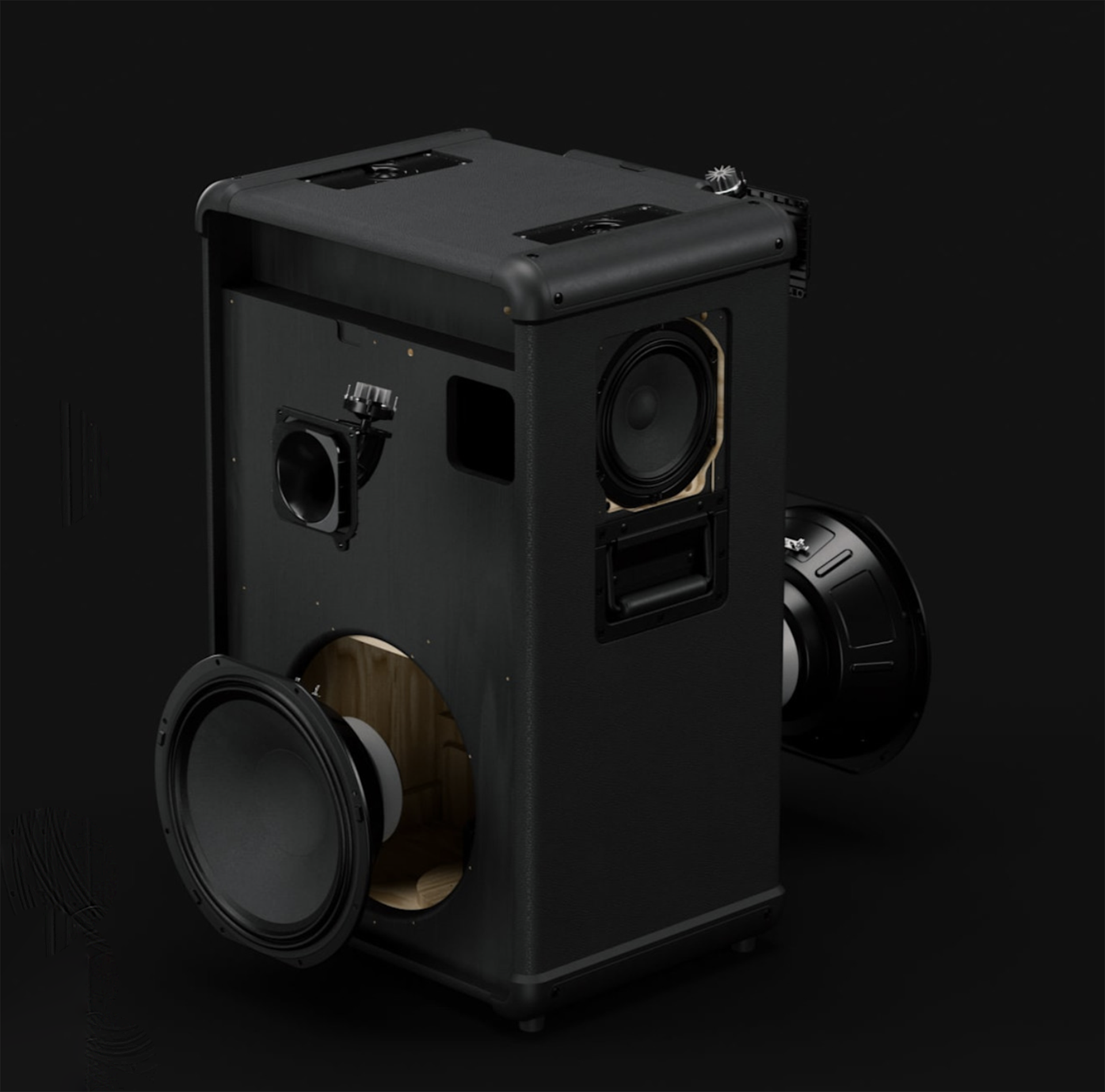 To 25 cm store basselementer, et foran og et bak, sørger for det massive trykket i bassen. Høyttaleren har mellomtoner og diskanter plassert på sidene, på toppen, og foran og bak, og de spiller stereolyd i 360 grader rundt høyttaleren.
