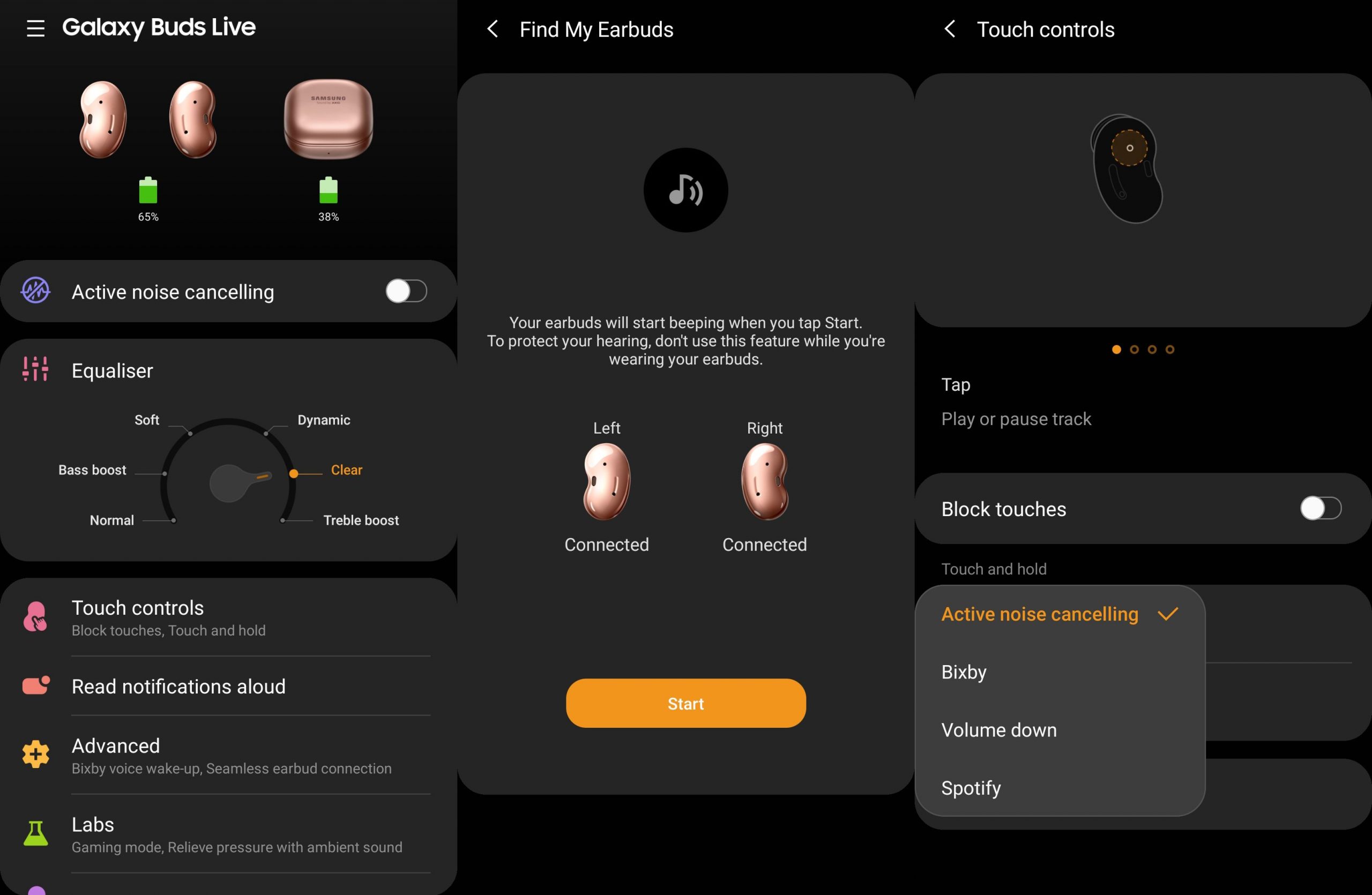 Med appens EQ-innstillinger kan man tilpasse lyden som man vil. Finner man ikke in-ear-proppene, kan man se i appen hvor de var sist, samt spille av en høy lyd slik at man kan lete seg frem til dem. Her slår man også på den aktive støyreduseringen og velger om stemmeassistenten skal lytte etter kommandoer. Kjedelig nok er det Bixby, den minst brukbare av alle. Hvorfor kan man ikke få bruke Google Assistant om man foretrekker den?
