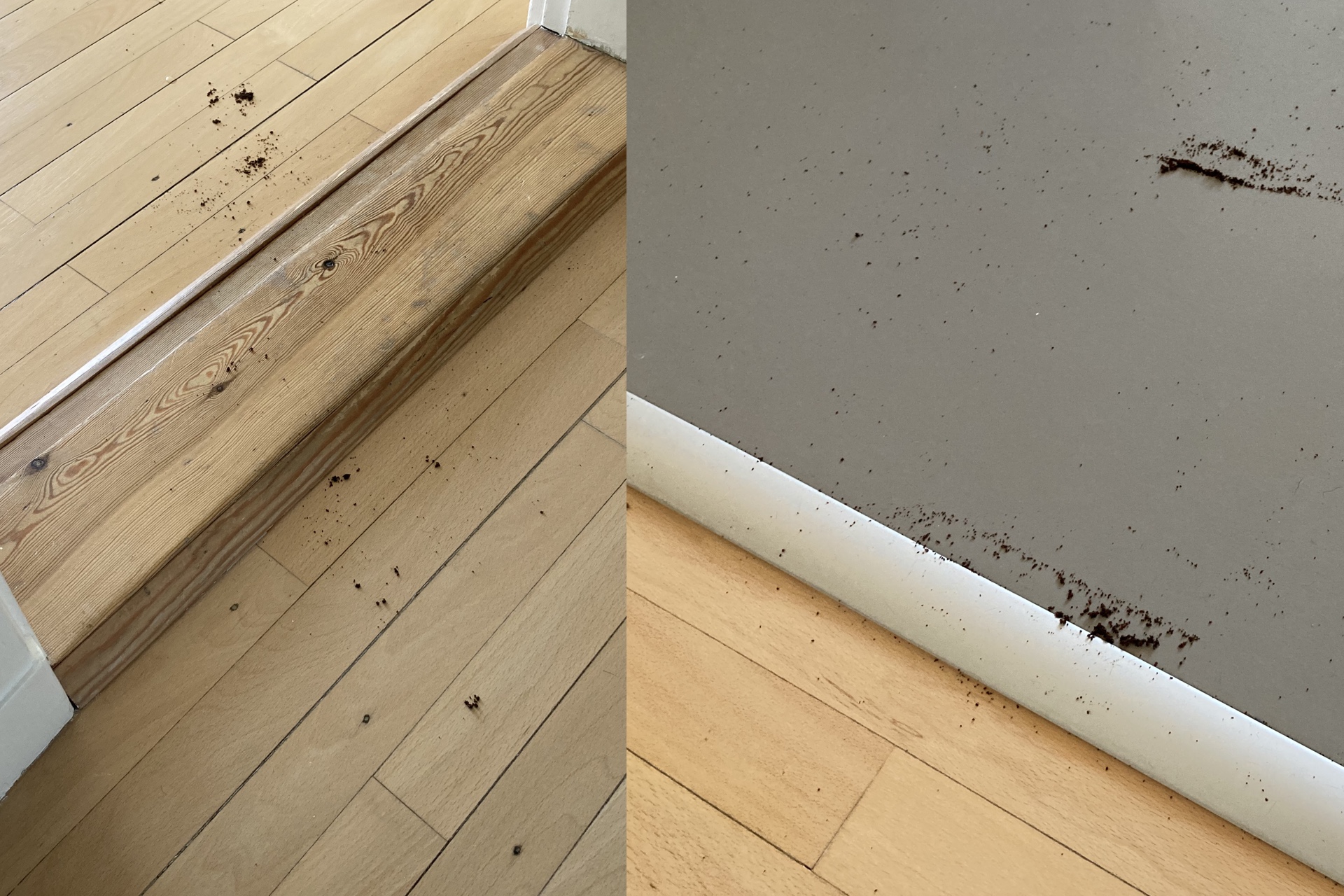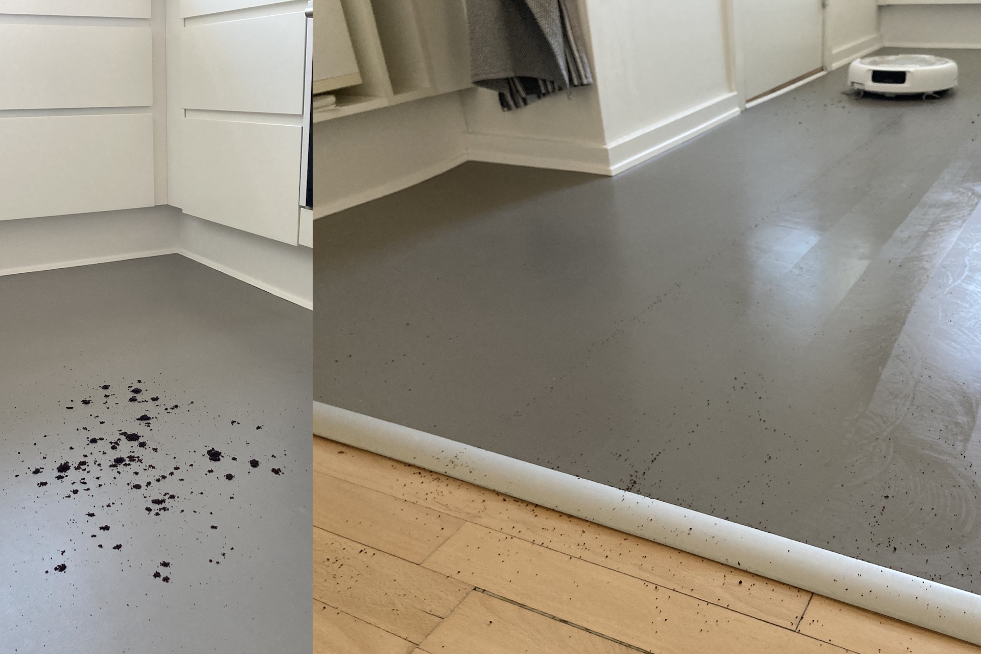 Etter endt oppgave dumpet roboten en større haug med grums midt på gulvet. På vei hjem til basen passerte Romo P en dørterskel og kastet her ut enda mer grums. Nå er kaffegrums noe av det verste for rengjøringsroboter, så oppgaven var heller ikke takknemlig.