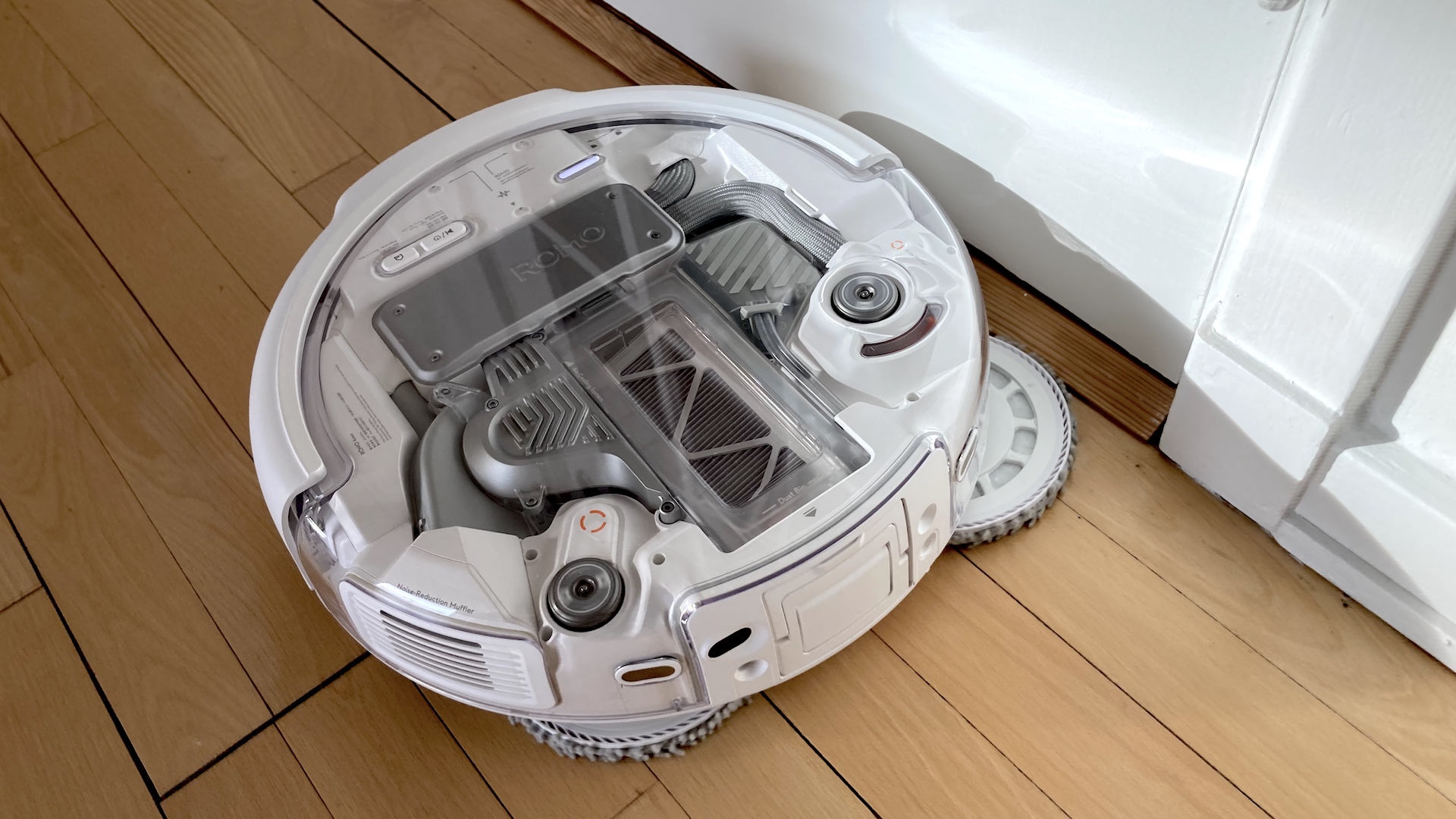 Gjennomsiktighet gjør ikke Romo P klokere eller mer effektiv. Til gjengjeld har den kurvede designen, som også kjennes fra Roborock Qrevo Curv, flere fordeler. Romo Ps buede base virker ikke dominerende i rommet, selv om du kan se innmaten og enkelte deler i grå og oransje farger.