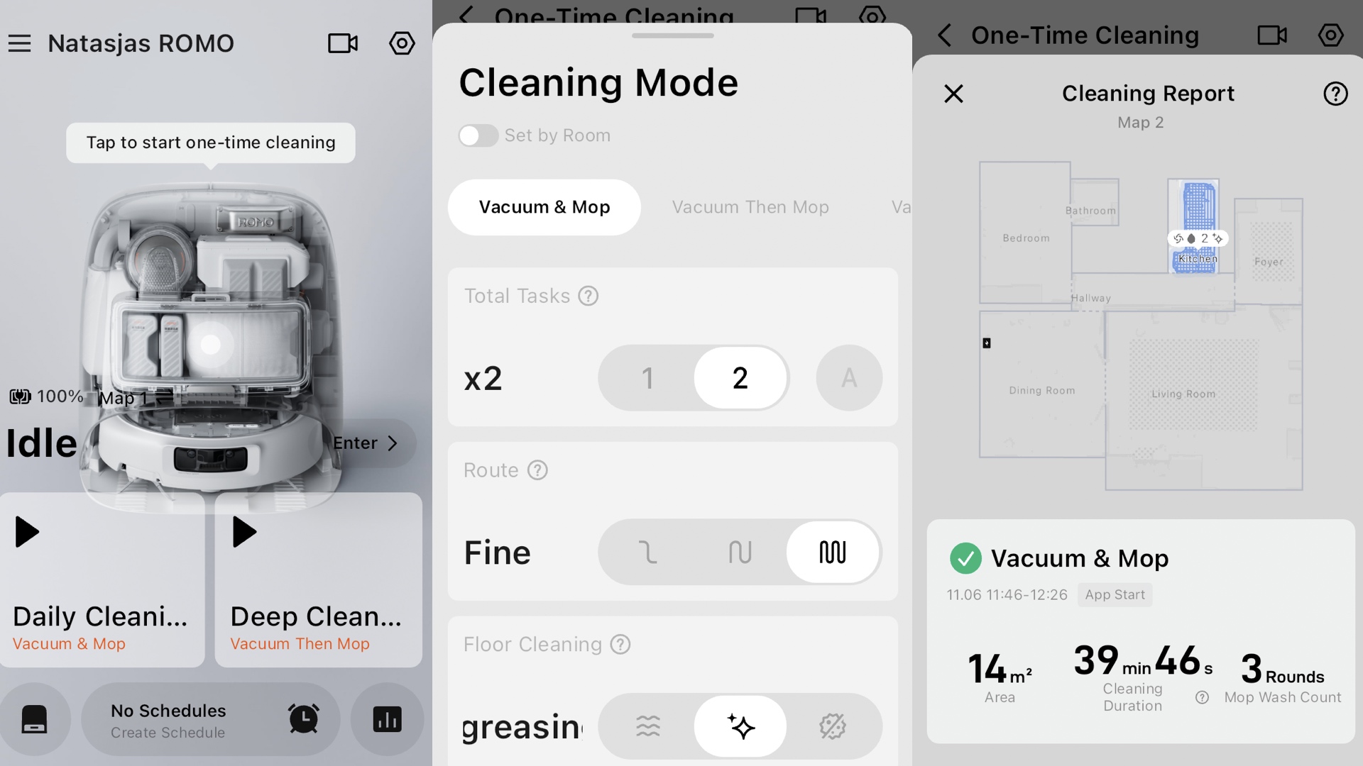 Til gjengjeld husker roboten dine ønsker for rengjøring av hvert rom når du har innstilt det i ”Set by Room”. Kanskje soveromsgulvet skal støvsuges på maksimal styrke, mens gulvet på kjøkkenet skal ha en grundig gulvvask med ekstra vann tilsatt og to gjennomløp.