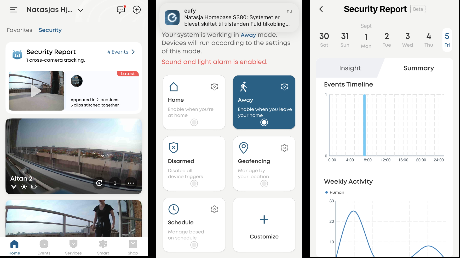 Lyskaster, sirene og toveiskommunikasjon kan aktives for hvert enkelt kamera. Kameraene fanger også opp hvis noen rører ved dem. Settets ene kamera lå på et altanbord. Et vindkast fikk åpenbart bordet til å riste, og bevegelsen ble straks registrert i form av en advarsel i appen.